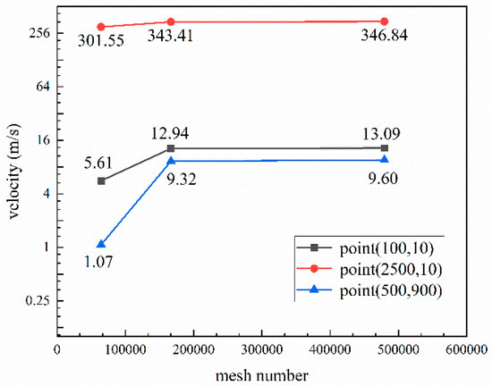 The initial mesh density was varied to increase calculation accuracy, we designed three different grids to verify the independence of the mesh, and the mesh numbers were 64,385, 166,772, and 47,950. Additionally, we chose three points (0, 0; 80, 10; 125, 15) to observe the changes in the velocity in different grids, which are shown in Figure 3.
