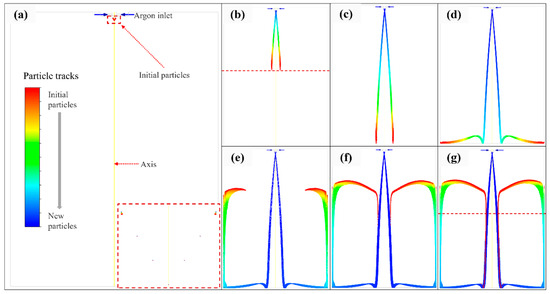 As shown in Figure 6, obvious particle recirculation was observed in the whole atomization chamber, which could mainly be classified into four steps. In the first step, the initial particles moved down and broke up with the high-speed argon until they came into contact with the bottom of the chamber (0.2769 s–0.3123 s). In the second step, the initial particles hit the bottom at a certain speed under argon and gravity and moved horizontally along the bottom after bouncing (0.3123 s–0.4034 s). In the third step, the initial particles moved upward along the chamber wall under the action of argon recirculation until the force provided by the argon was insufficient to resist the gravity of the particles themselves (0.4034 s–0.8993 s). In the furth step, the upward kinetic energy of the initial particles ran out, and the particles began to move towards the center, relying on the argon recirculation zone, then merged into the particle stream produced in the first step and collided with it to form satellite powders. Figure 6 demonstrates the presence of particle recirculation and the possibility of satellite formation.