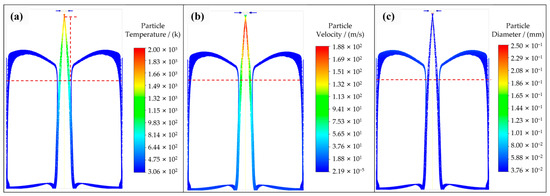 According to Equation (10), the cooling rate was calculated as 5.65 × 104 K/s, and the particle temperature dropped by 604.4 K in the process from Figure 6a to Figure 6b, which is consistent with the particle temperature variable result in Figure 7a.