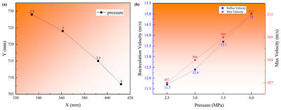 The recirculation zone characteristics at different atomization pressures. (a) Centric position, (b) recirculation velocity and max velocity.