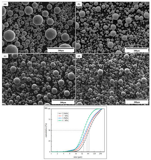 SEM images and distributions of atomized powders. (a) 2.5 MPa, (b) 3.0 MPa, (c) 3.5 MPa, (d) 4.0 MPa, and (e) particle size distribution.