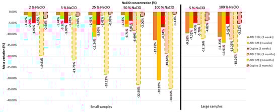 As for the large samples, after three weeks, the Duplex 14462 suffered a reduced mass variation, while the AISI 321 was greatly affected by the solution, leading to a greater loss of material. Although in low concentrations the AISI 321 steel suffers less mass variation than the AISI 316L, when the concentration increases, it is the former that suffers more mass loss. Three months following the immersion, the AISI 316L, unlike that at three weeks, suffered a low mass variation for 5% NaClO but was more affected for 100% NaClO. The AISI 321 continues to be the most affected and the Duplex 14462 continues to be the most resistant to the corrosive action of the solution, although it did not have as good results as in the previous case, meaning that it resists corrosion better in the long term with small samples.