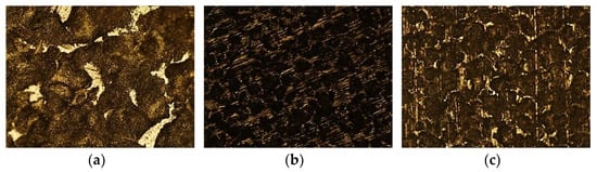 The Duplex 14462, also with a 100× magnification, had a better behavior than the first two alloys; however, the chlorine’s effect can be observed. Figure 5 shows the sample before contact with the solution (a), after three weeks (b) and after three months (c).