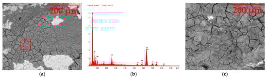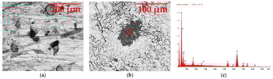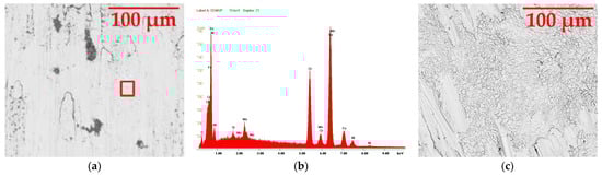 Figure 7 shows the AISI 321 stainless steel sample in the SEM with 1000× magnification in two situations: after three weeks (a) and after three months of immersion (b). In the second image, the corrosion effect was greater, as visible through the increase in the circular pitting size and the darker color in its center. Image (c) shows the EDS graph of the darker area of image (b), highlighted through a red square and present in Figure A3.
