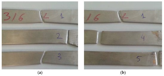 As for the AISI 321, Figure 12 shows the three specimens at three weeks (a) and three months of immersion (b) after the tensile test: standard sample at the top, 5% NaClO in the middle and 100% NaClO at the bottom.