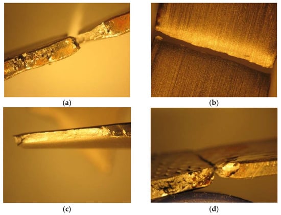 Figure 10 highlights the fracture zone of the samples immersed in 5% NaClO and 100% NaClO after three weeks ((a) and (c)) and three months ((b) and (d)).