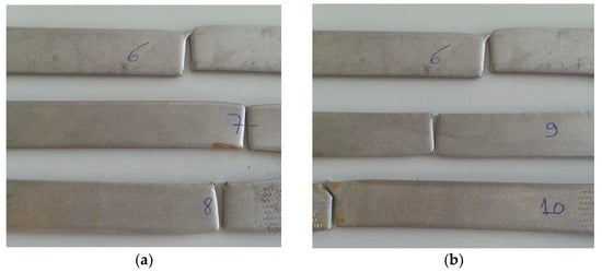 The Duplex 14462 samples after the tensile test are presented in Figure 15. The standard sample is at the top, that immersed in 5% NaClO is at the center and that immersed in 100% NaClO is at the bottom, at three weeks (a) and three months (b) of immersion.