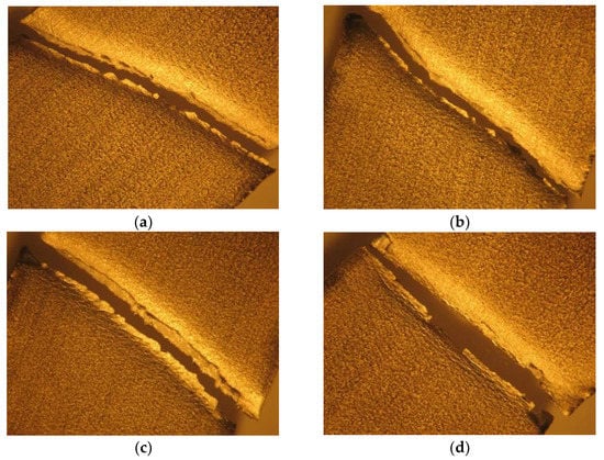 In Figure 13, the detail of the rupture zone in the two immersed samples is shown: 5% NaClO and 100% NaClO after three weeks ((a) and (c)) and three months ((b) and (d)).