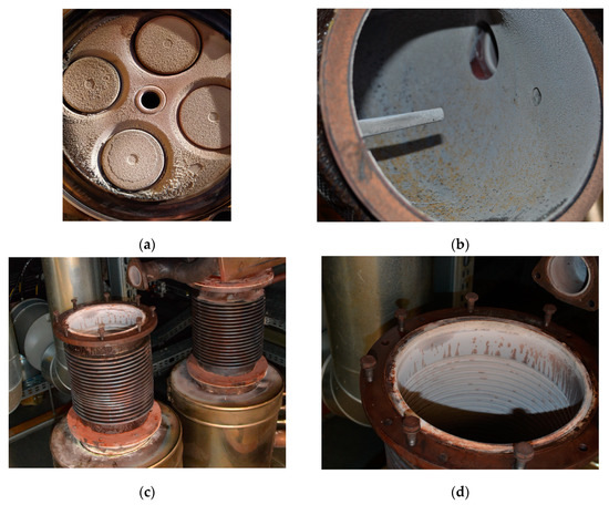 Deposits formed on different parts of gas engine: (a) cylinder head with valves; (b) exhaust pipe in front of the chimney inlet; (c,d) roof exhaust pipe/flue.