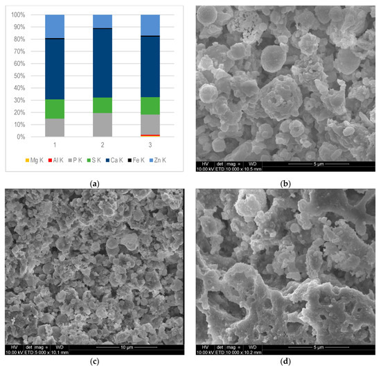 The composition of deposits sampled from the combustion chamber was very similar. The largest mass contribution was observed for Ca (49–56%). In analysed deposits, the contents of P, Zn, and S were in the ranges 15–20%, 11–19%, and 13–16%, respectively. Fe content was found in all tested samples (0.64–0.81%), while Al was present (0.26–0.76%) in samples 1 and 3. The presence of Mg (0.93%) was found only in deposit (sample) 3.