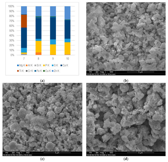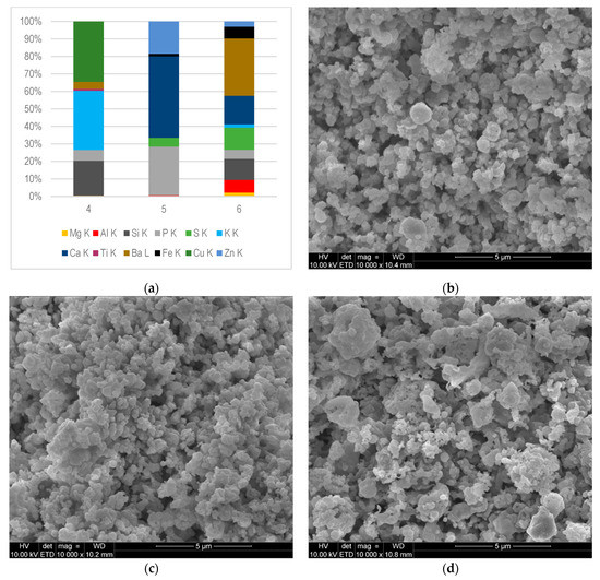 Figure 5a shows the results of SEM-EDS analysis of the deposits collected from different places of the exhaust pipe and flue: sample 7—from exhaust pipe in front of the flue, while sample 8 was collected from the beginning; 9—from the middle part; and 10—from the terminus (outlet) of the exhaust, respectively. Figure 5b–d present the morphologies of samples 8, 9, and 10.