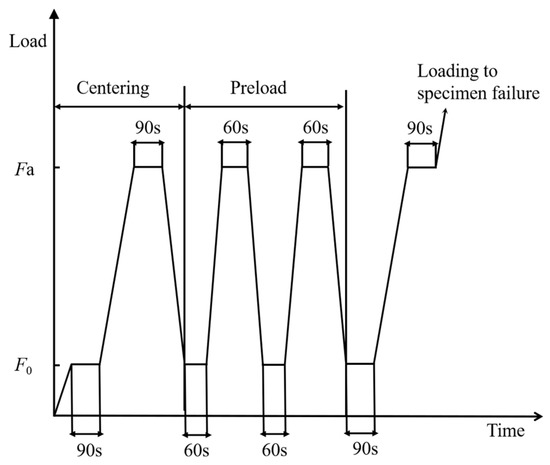 The test loading method of elastic modulus is shown in Figure 4 and Figure 5. The loading rate of the elastic modulus was 0.5 MPa/s, the reference load value F0 was 0.5 MPa, and the maximum preload value Fa was 1/3 of the axial compressive strength of the specimen. After the preload was centered, three repeated preloadings were performed between F0 and Fa. When loading to F0 and Fa, the dead load was 60 s, and the deformation value of each measuring point was recorded, and then the elastic modulus was calculated.