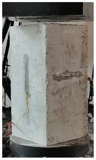 An electro-hydraulic servo pressure testing machine (WAW-2000) with a maximum test force of 5000 kN was used. The cubic and axial compressive strength tests were carried out per “Standard for test methods of concrete physical and mechanical properties” (China, GB/T50081-2019) [37], with a loading rate of 0.5 MPa/s. The BF content and replacement ratio of RCA were used as the variables. Fifteen cubes with dimensions of 150 mm × 150 mm × 150 mm were fabricated for the cubic compressive strength test, whereas 15 prisms of dimensions 150 mm × 150 mm × 300 mm were fabricated for the axial compression, elastic modulus, and Poisson’s ratio tests.