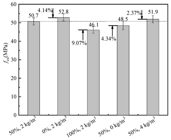 where the replacement ratio of RCA is represented by γ, the BF content is represented by λ, fcu,γ represents the cubic compressive strength values of BFRRAC with a BF content of 2 kg/m3 under different RCA replacement ratios, fcu,a represents the cubic compressive strength value of BFRRAC at a BF content of 2 kg/m3 and a RCA replacement ratio of 0%, fcu,λ represents the cubic compressive strength values of BFRRAC with a RCA replacement ratio of 50% under different BF contents, and fcu,b represents the cubic compressive strength of BFRRAC at a BF content of 0 kg/m3 and a RCA replacement ratio of 50%.