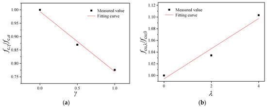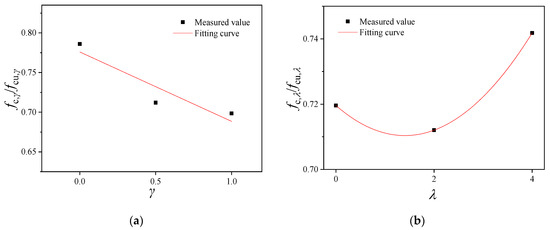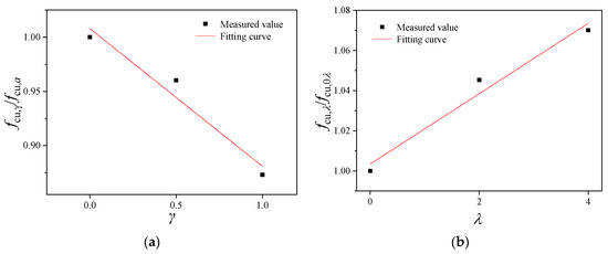 The fitting curve of the cubic compressive strength of specimens under different variable parameters: (a) fitting curve of fcu,γ/fcu,a and γ (b) fitting curve of fcu,λ/fcu,b and λ.