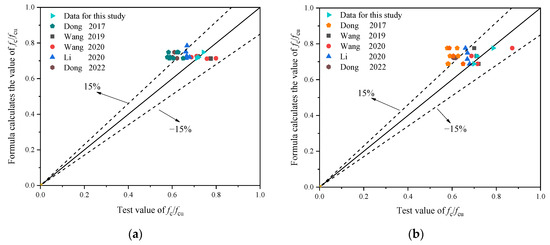 To further verify the applicability of the calculation formula, the compressive strength of specimens under different BF contents [33,34,39,41,42] and different replacement ratios [33,34,39,41,42] were substituted into the formula calculation, the comparison between the fc/fcu test result and the calculation result based on Equations (5) and (6) is shown in Figure 13a,b, respectively. It can be observed that the formula calculation results were in good agreement with the test results.