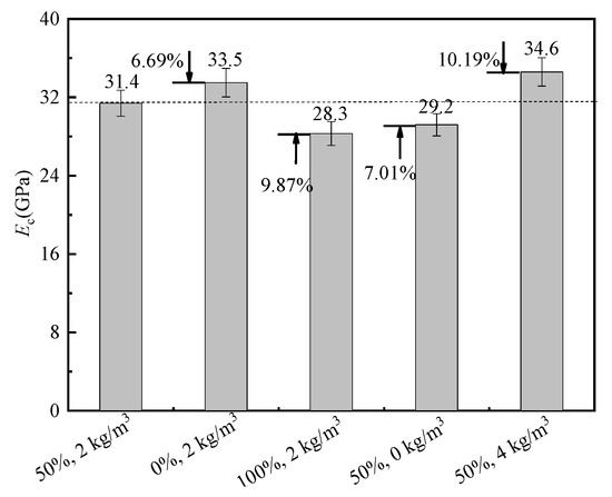 where Ec,γ represents the calculated elastic modulus of BFRRAC with a BF content of 2 kg/m3 under different RCA replacement ratios, and Ec,λ represents the calculated elastic modulus of BFRRAC with an RCA replacement ratio 50% under different BF contents.