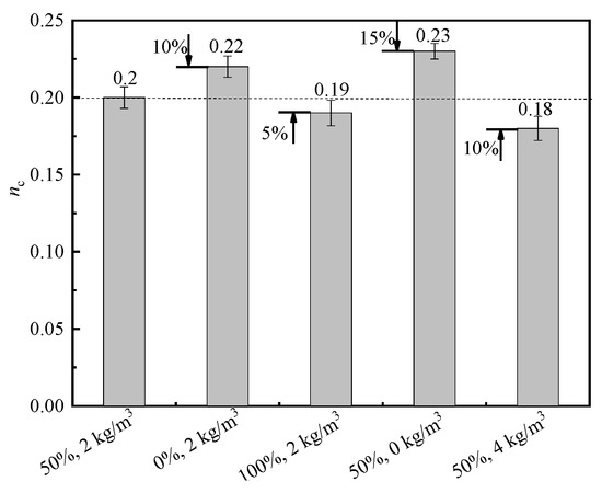 where fc,γ represents the axial compressive strength values of BFRRAC at a BF content of 2 kg/m3 under different RCA replacement ratios, fc,a represents the axial compressive strength of BFRRAC at a BF content of 2 kg/m3 and a RCA replacement ratio of 0%, fc,λ represents the axial compressive strengths of BFRRAC at a RCA replacement ratio of 50% under different BF contents, and fc,b represents the axial compressive strength of BFRRAC at a BF content of 0 kg/m3 and a RCA replacement ratio of 50%.