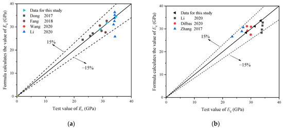 To further verify the applicability of the calculation formula, the specimen data under different BF contents [33,35,39,41] and different replacement ratios [28,41,44] were substituted into the formula calculation; the comparison between the test result and the formula calculation result of Ec based on Equations (8) and (9) is shown in Figure 17a and Figure 17b, respectively. It can be observed that the formula calculation results were in good agreement with the test results.