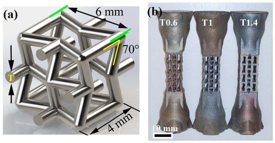 (a) Shape and dimensions of one unit cell of the printed 316L lattice structure; (b) macrograph of H charging sample geometry showing the lattice structure with different thicknesses. T refers to the strut thickness.