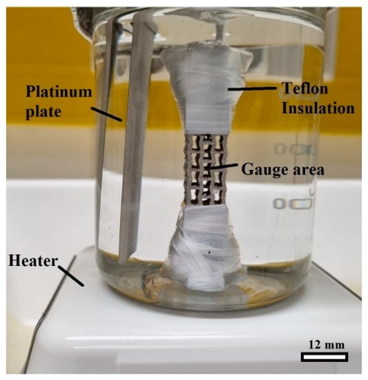 The electrochemical H-charging process was conducted using a solution of 3% NaOH and 3 g/L CH4N2S (Thiourea) for 24 h at 80 °C under a constant current density of 20 mA·cm−2. The temperature was monitored by a mercury thermometer during the H-charging process. A platinum plate was used as a counter electrode. During the H charging, the gauge area was in direct contact with the solution, while the other surfaces were insulated by Teflon. A macrograph of the setup used during the H-charging process in the present study is shown in Figure 2.