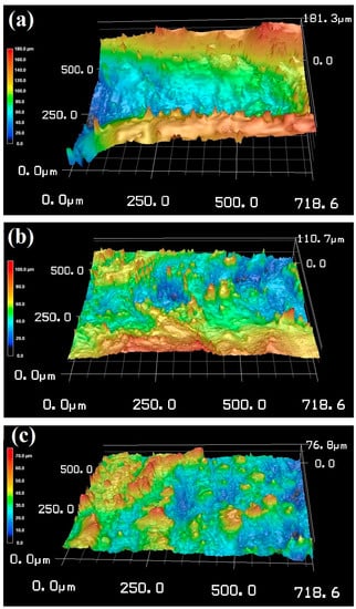 The laser microscope 3D profiles of the surface topography of the 3D-printed 316L lattice structures at various thicknesses (T0.6, T1, and T1.4) are displayed in Figure 3. The roughness measurements were taken along several lines over the surface. The topography of the surface increased as the strut thickness was reduced. For instance, the average surface roughness values (Ra) of T0.6, T1, and T1.4 were 21 ± 4, 10 ± 2, and 8 ± 2 μm, respectively. In agreement with Ahuja et al. [] and Niendorf et al. [], the surface roughness of the AM steel increases with decreasing thickness. It is worth noting that surface roughness affects the H penetration of the metals, as reported in the literature [,].