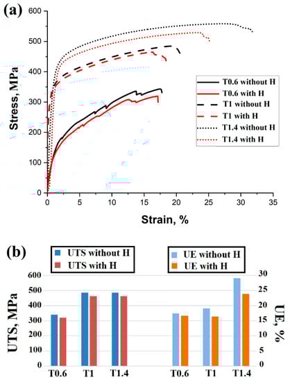With H charging, the strength of the studied thicknesses was slightly decreased, as shown by the flow curves in Figure 4. For example, for T1.4 the UTS has decreased from 550 to 523 MPa, roughly a 5% reduction. This confirms the high resistance of 316L-SS to HE susceptibility. However, the reduction in UE increases with thickness. For instance, T1.4 displayed the highest percentage of UE reduction, approximately 17.6%.