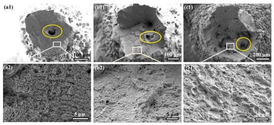 Figure 5 displays the fractography of the H-free specimens after tensile testing. Cup-and-cone-type fracture dominated the fracture surfaces of the various thicknesses. This indicates ductile fracture of the auxetic structures regardless of the thickness, as shown in Figure 5a1–c1. The magnified views (inside the white squares) of the fracture surfaces display the dimple feature, which confirms the ductile fracture type, as shown in Figure 5a2–c2. Ductile fracture of AM 316L-SS has been reported by several previous studies, which stated that dimples are promoted due to microvoid coalescence after fracture of the solid 316L-SS [,]. A striking feature is the presence of pores with different sizes in the auxetic structures, highlighted by the yellow ovals. The pores range in size between 30 and 60 μm. It is reported that the appearance of the pores in AM products is related to different uncontrolled printing conditions, such as gas absorption when excessive laser energy is applied [], incomplete fusion of the powder due to insufficient energy input [], laser beam penetration of a solid established layer, or inadequate penetration of molten metal through a previously formed layer during printing [].