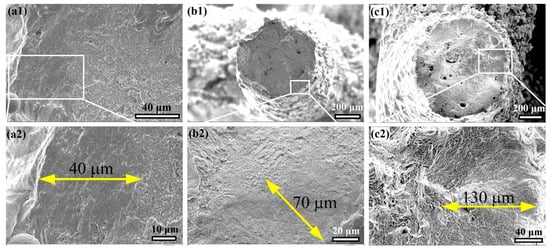 The fracture surfaces of the H-free specimens. SEM images of (a) T0.6, (b) T1, and (c) T1.4 after tensile testing. The magnification views in (a2,b2,c2) are selected as indicated by the white rectangles in (a1,b1,c1).