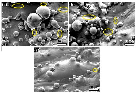 SEM images of the surface morphology of the printed 316L-SS specimens: (a) T0.6, (b) T1, and (c) T1.4. The yellow ovals refer to the surface flaws.