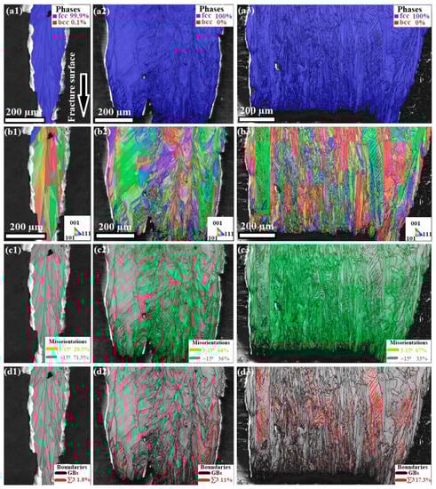 Figure 8 shows the EBSD maps of the microstructures of the auxetic 316L-SS specimens that have undergone H charging and subsequent tensile testing. The microstructure examination was conducted at the gauge area near the fracture surface. It is evident that the phase maps, shown in Figure 8a1–a3, of the H-charged microstructures display only blue color, which confirms a uniaustenitic phase in the structure, i.e., fully austenite γ-FCC without phase transformation, regardless of the strut thickness variation. This is attributed to the high stability of the 316L-SS against phase transformation that is related to the stacking fault energy (SFE). It has been reported that the SFE of 316L-SS is 27 mJ·m−2, as stated by Jaskari et al. []. It has been established that the SFE controls the deformation mechanism of austenitic stainless steel. Martensitic transformation is favorable at a SFE values less than 18 mJ·m−2. However, at an intermediate SFE value, 18–45 mJ·m−2, a mechanical twinning deformation mechanism is favorable [,,].