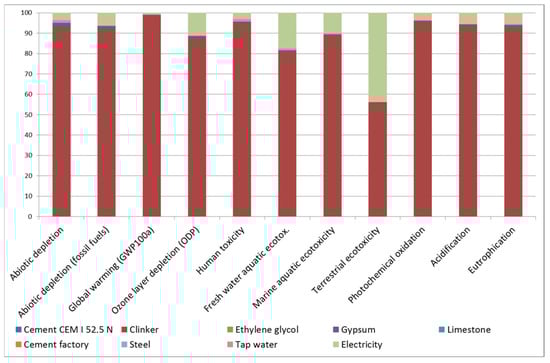 LCA determined that the CEM I manufactured in the region had a GWP of 748.6 kg CO2eq. Analysing the contribution of each fabrication process to each impact category (Figure 1), it is worth noting that clinker is responsible for 80% of the impact in all of them, except for terrestrial ecotoxicity, in which it is responsible for 55%. In that category, high-voltage electricity supply is the second-highest source of impact.