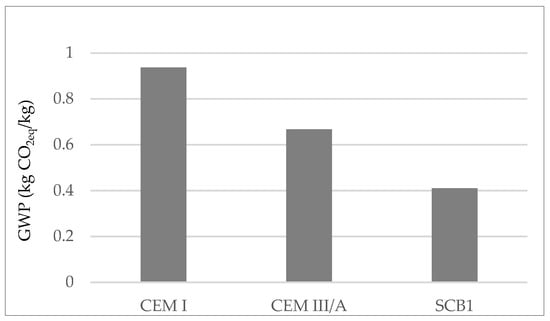 It is worth mentioning that the GWP associated with the CEM I assessed is lower than in the literature [49,50]. This is attributed to the fact that the stone extraction quarry is located behind the cement factory, avoiding the significant impact of transport. Therefore, to compare the potential environmental impacts of the binders under study the data from the Ecoinvent v3.3 database for Europe was also used and the compositions of the cements as per EN 197-1 were applied. Figure 2 shows the results in terms of GWP as greatest environmental impact.