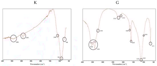 Figure 3 shows the FTIR spectra of clinker (K) and gypsum (G), identifying the most important peaks.