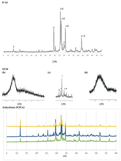 Diffractograms: (a) clinker (K), where A is C3S, B is C2S, C is C3A and F is C4AF. SCM: (b) blast furnace slag (S). (c) SCM2, where A is C3S, B is C2S, Q is quartz and S is silicate. (d) Fibreglass (FG). (e) Anhydrous SCB: green: CEM III/A; dark blue: SCB1; yellow: SCB2.