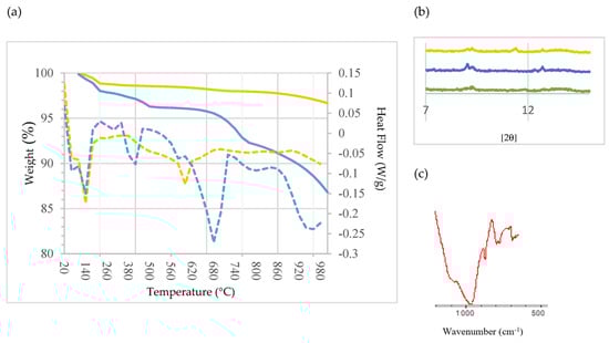(a) TG/DTG analysis of the SCBs: blue: SCB1; yellow: SCB2. Solid line: Weight (%), dotted line: Heat Flow (W/g). (b) XRD pattern of CEM III/A (green), SCB1 (blue) and SCB2 (yellow). (c) FTIR spectrum of SCB1.