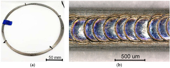 As-delivered NiTi wire (a) and an example of the overlapping seam weld (b).