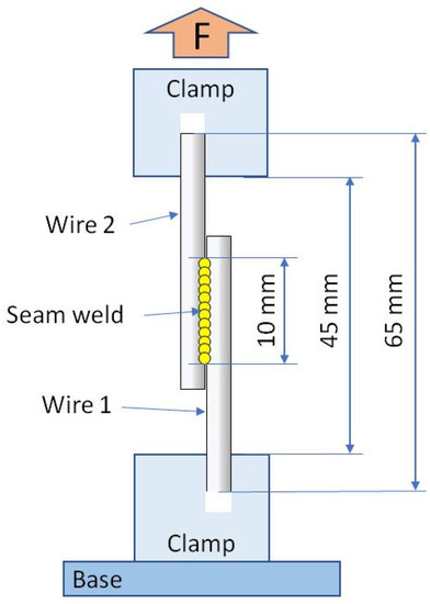 The tensile test to determine the shear strength of the weld was performed on the universal testing machine Zwick 1435 Retroline (Zwick Roell, Ulm, Germany) equipped with the 5 kN load cell. The measurements were carried out at room temperature, following the ASTM F2516 standard due to the practical application of welded wires. The diagram of the sample mounting and the acting force is shown in Figure 2.