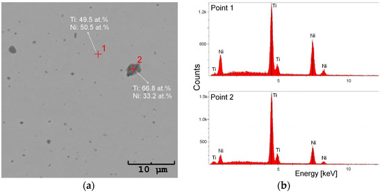 In order to characterize the wire before welding, the detailed analyses of the microstructure and chemical composition were carried out on transverse and longitudinal cross-sections. An example of microscopic observations is shown in Figure 3. The images revealed the compact structure of the wire, free of discontinuities, pores, or micro/macro cracks. However, there were numerous particles ranging from several tens of nanometers to several micrometers in size (Figure 3). The average chemical composition of the matrix oscillated around the equiatomic one. A slight nickel predominance with the differences in tenths of a percent was found, practically the same in both cross-sections (Table 1). The chemical composition analysis of the particles showed that they contained almost twice as much titanium as nickel—which is characteristic of the Ti2Ni equilibrium phase (Figure 4).