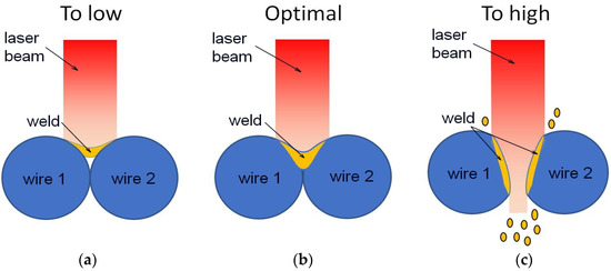 - The applied laser beam power influenced the shape of the weld. The power ranged from 12% to 14%, assuming the complete filling of the space between the welded wires was achieved. However, the laser power above 14% caused the crater formation and the perforation of the joint.