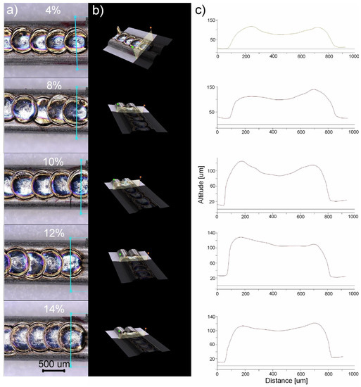 Figure 7 shows how the laser power formed the weld bead. Based on the microscopic images, using 3D modelling (Figure 7b), the weld’s cross-section was determined (Figure 7c). The results showed that welding with a laser power lower than 4% produced a small fusion volume (Figure 7—part relating to 4%). On the contrary, the laser power above 16% formed a welding crater. Consequently, the laser power above 50% caused the weld’s gradual, power-dependent perforation. A completely different shape was obtained by applying the 8–14% power. The comparison showed that in that case the fusion profile was the closest to the optimal one (Figure 6b). That is why the welds produced with the 4–14% laser power were selected for further research.