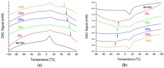 The occurrence of martensitic transformation and its reversibility is the most important information coming from the thermal analysis. In the DSC cooling curves, there were thermal peaks (Figure 8a) which corresponded to the peaks in the heating direction (Figure 8b). They were broadened, as compared to the ones appearing in the solid material produced via traditional casting. This phenomenon resulted from the grain refinement and/or the increase in the density of structural defects—primarily dislocations. The dislocations are characteristic for the wire production—particularly, while reducing the wire diameter. An additional effect visible on the DSC curves was the multi-stage transformation depending on the applied laser power. The DSC cooling curves showed deviations from the baseline in the 55–75 °C range (indicated by arrows in Figure 8a), and in the −40 °C to −10 °C range in the heating curves (indicated by arrows in Figure 8b). The similar thermal behavior was observed for the laser-treated wire of 100 µm in thickness [27].