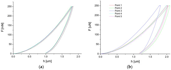 The micromechanical tests were performed with the Micro Combi Tester—MCT3 device (Anton Paar, Corcelles-Cormondrèche, Switzerland). The measurements complied with the ISO 14577 standard. The Berkovich diamond indenter (B-V 83) was used with the maximum load of 250 mN and a load/time of 30 s. The HVIT hardness (hardness determined during indentation) was determined by the Oliver–Pharr method [24,25].