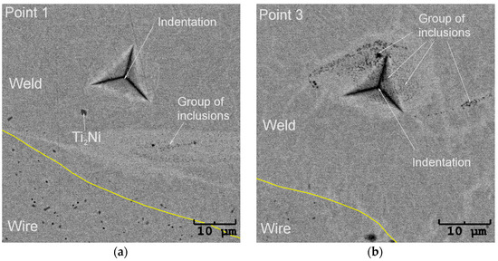 The determined average microhardness for the wire in the initial state equalled 381, which was slightly higher than the cited literature data. The reason behind this result might be the Ti2Ni particles’ presence. Figure 11 shows the SEM image with an exemplary indentation in the wire cross-section. The densely distributed Ti2Ni particles can be clearly distinguished from the NiTi matrix. Their influence on the measurement cannot be avoided, as it is known that the increased density of dislocations and the decreasing grain size affect mechanical properties. Such phenomena led to the reduction of the wire diameter and the mechanical properties increase, e.g., hardness. In the fusion area, the Ti2Ni precipitates which were characteristic of the wire microstructure in the initial state were not noted. They appeared only sporadically on the edges of the weld. In the heat-affected zone, the chemical composition differed in comparison to the internal part of the wires. The melting process eliminated structural defects such as dislocations. Both facts contributed to the lower microhardness. For the lowest welding power of 4%—the determined hardness decreased to almost 282. However, increasing the welding power caused the microhardness boost, and for 14%, it was 321. This trend was consistent with [31,32]. In our studies, the microhardness increase took place due to inclusions—the (Ti,Ni)C phase containing over 50 at.% of carbon. The particles formed clusters around the remelted weld bead as the laser power increased. For the lower laser powers (e.g., 8%), the clusters were observed only at the surface of the weld face. While increasing the welding power, the clusters appeared throughout the entire welded volume, affecting the microhardness value (Figure 10b). An exemplary microstructure of the indentation area free of inclusions is shown in Figure 12a—marked as Point 1. The representative curve measured for this indent refers to the red line marked in Figure 10b. Its shape and course are characteristic of the remaining measured points, except for Point 3—a blue line in Figure 10b. The microstructure observed for Point 3—Figure 12b—revealed a band of hard inclusions containing the (Ti,Ni)C phase, particularly in the indented area. Consequently, the micro-hardness determined for Point 3 was 360, which was comparable to the wire in the initial state. Increasing the volume fraction of the carbide phase in the weld boosted its hardness.