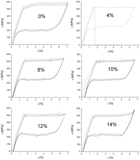 In the case of the reverse transformation, for the as-received wire, the stress inducing the martensitic transformation was the lowest and amounted to about 190 MPa. For the welded wires (the laser power from 4% to 12%), the first cycle required about 265 MPa to start the reverse transformation. For 14%, it was the lowest one—255 MPa. This means that for the welded specimens, the wire began to return to its original shape at a higher stress.