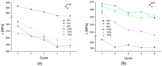 The critical stress to induce the martensitic transformation was calculated from the load/unload curves. The results, depending on the applied laser power, are shown in Figure 14. In the case of the forward martensitic transformation, the critical stress reached the highest value of 587 MPa for the as-received wire. Similar results were obtained by the authors in [20]. The cyclic load/unload repetition decreased the critical stress to 549 MPa for the fourth cycle, and for the fifth cycle it remained the same. This means that after four cycles, the martensitic transformation began to stabilize. The samples welded with the 4% and 8% powers revealed a similar strain of 524 MPa. The 10% and 12% welded samples required 518 MPa to induce martensite. Welding with the 14% power significantly reduced the critical stress value to 507 MPa, which was notably different from the wire’s initial state. The fourth and fifth cycle load/unload gave similar results to the initial state results, regardless of the applied welding power.