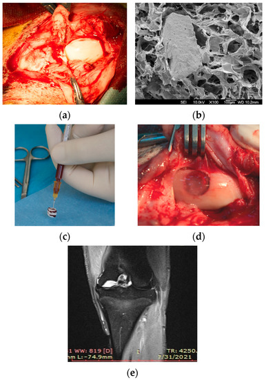 (a) Medial parapatellar approach over the left knee; (b) SEM image of porous collagen graft containing hydroxyapatite and tricalcium phosphate; (c) Injection of stem cells concentrate into the porous collagen implant; (d) Implant fixation in the defect using fibrin sealant; (e) MRI image after surgical intervention.