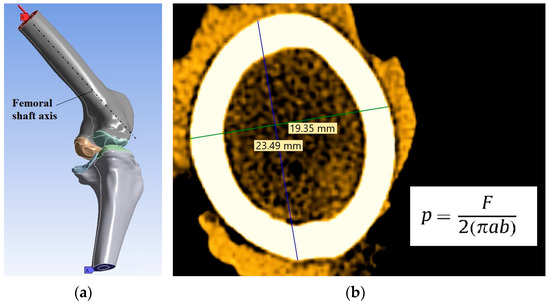 The knee joint force was applied on the bottom plane of the femur as a pressure (p) calculated with the equation detailed in Figure 3b, where F is the normal force on the whole knee joint, a and b are the major and minor axes lengths of the elliptical cross section of the femur. The force acting on the sheep’s knee joint is 2.1–2.25 times the weight of the animal [1,51,52]. Considering these recommendations and the fact that the mean animal weight was 50 kg, a pressure of 0.38 MPa was calculated utilizing femoral dimensions and the equation presented in Figure 3b. This pressure was applied to the virtual knee, and it represents a common situation in joints during daily activities. Moreover, a pressure of 0.76 MPa was applied. This high pressure was introduced to analyze the knee behavior after a traumatic injury at osseocartilaginous reconstruction level (for example falls or direct blows of the knee which was surgically treated 7 months ago). Every pressure was applied constantly and uniformly, and the direction of it was parallel with the axis of femoral diaphysis, as mentioned in Figure 3a.