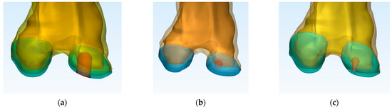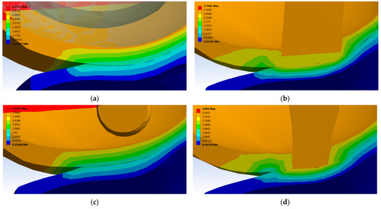 Figure 7 illustrates the total deformations in contact areas where the treatments have been applied. Following a pressure of 0.38 MPa, the healthy contact areas of tibial cartilage have a total deformation of maximum 1.8 mm (Figure 7a). In Case 1 and Case 3, the tibial cartilage undergoes a higher deformation of 2.6–2.7 mm (Figure 7b,d).