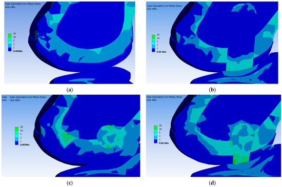 Distribution of von Mises stress in contact area of cartilage, after applying a normal pressure of 0.38 MPa: (a) Case 0 (healthy knee); (b) Case 1 (just porous Collagen); (c) Case 2 (Collagen + BMC); (d) Case 3 (Collagen + ASC).